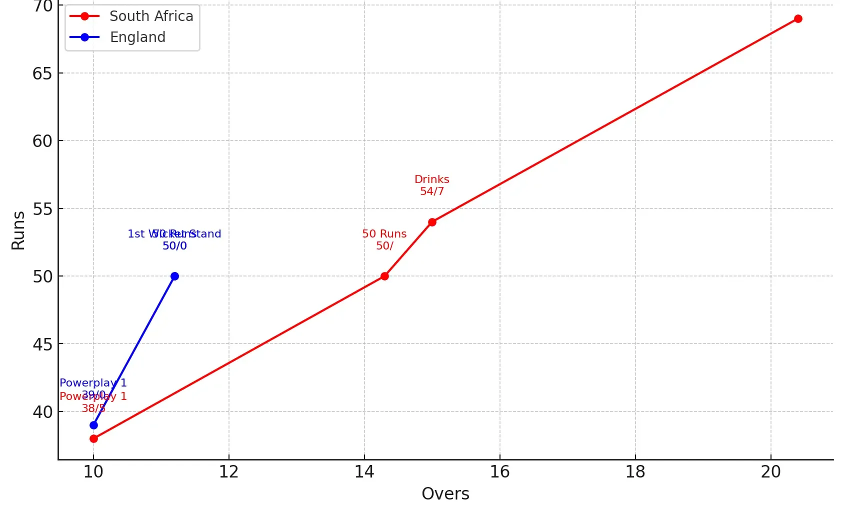 - Powerplay 1: Overs 0.1 – 10.0 (Mandatory – 39 runs, 0 wicket)