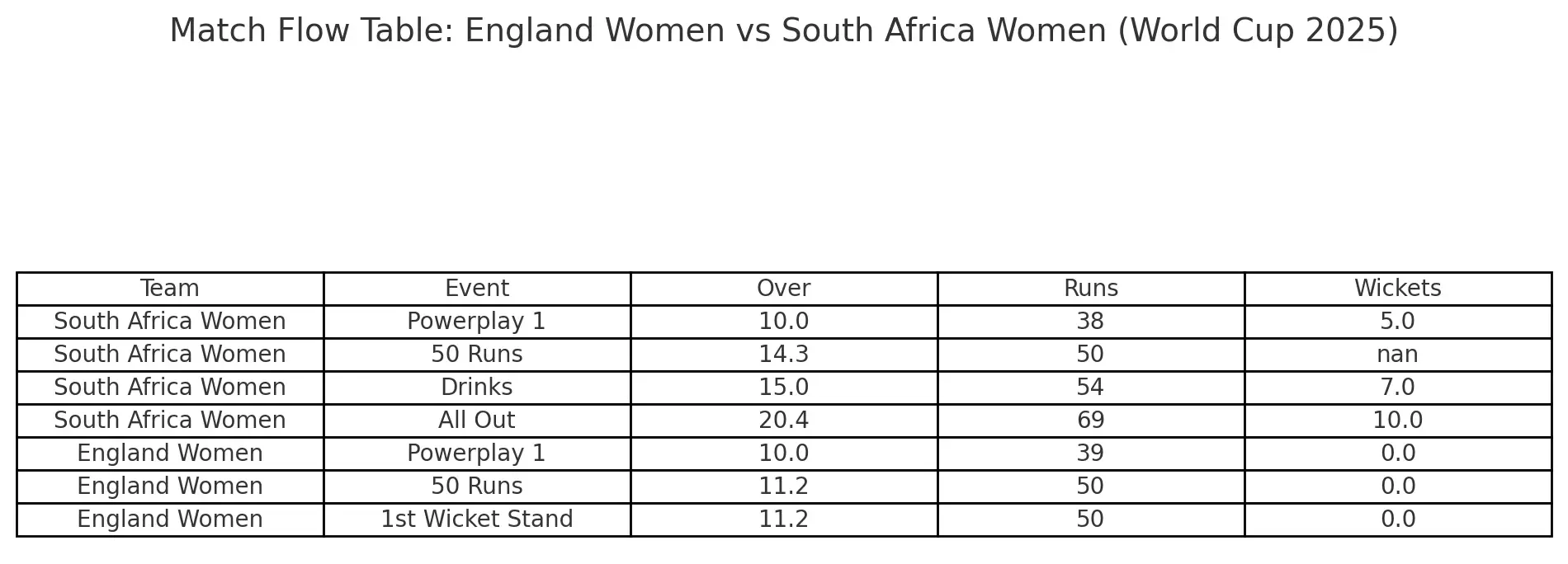 - South Africa Women: 50 runs in 14.3 overs (87 balls), Extras 7