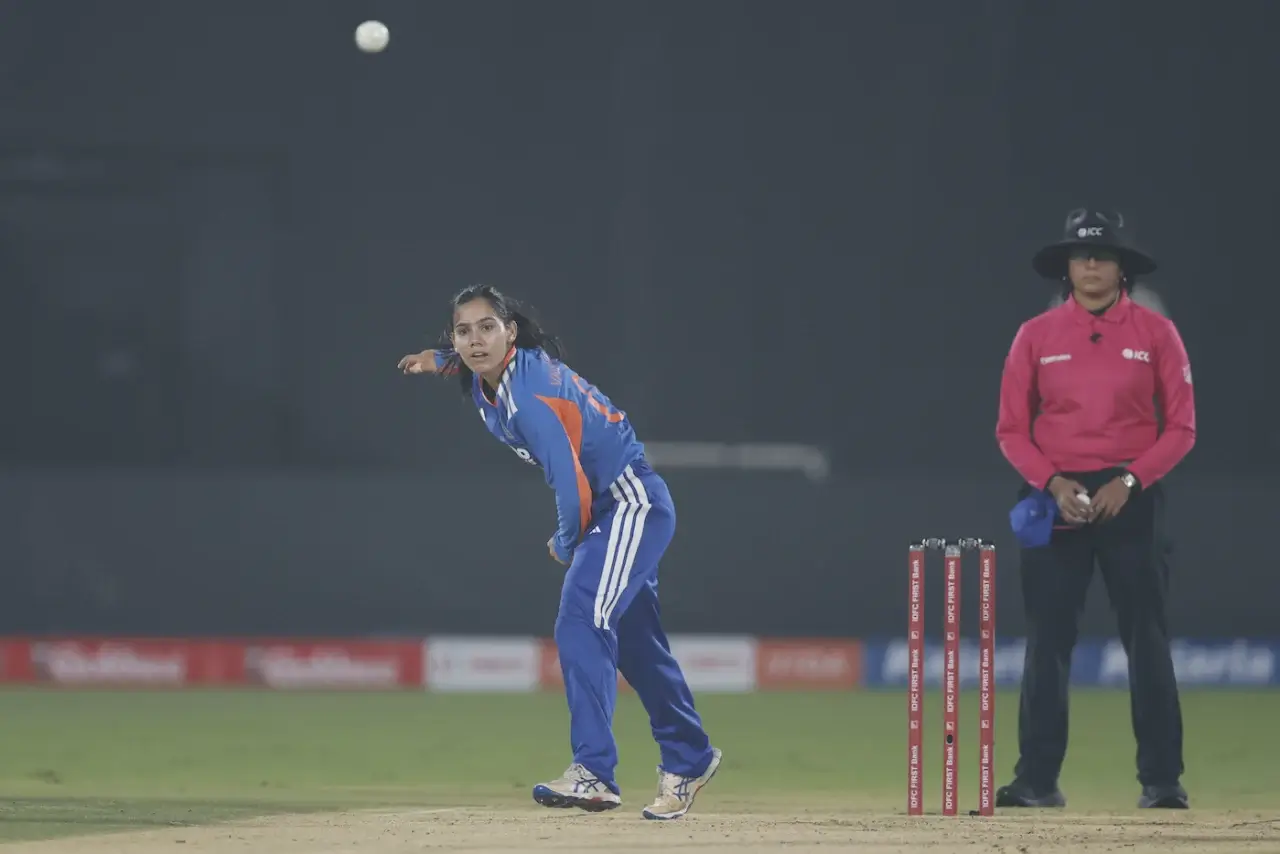 Vaishnavi’s international debut did not begin with a celebration. A simple catch went down early, denying her a wicket with her 12th delivery in T20Is. Lesser players often show frustration in such moments. Vaishnavi showed none. She finished her spell wicketless but conceded only sixteen runs across four overs, without offering a single boundary.