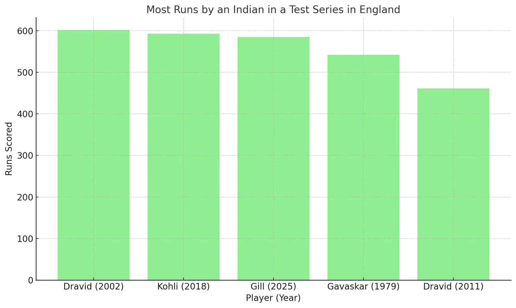 | 3rd Most by Indian in England Series | Shubman Gill (IND) | 585 (2025 Series) | England |