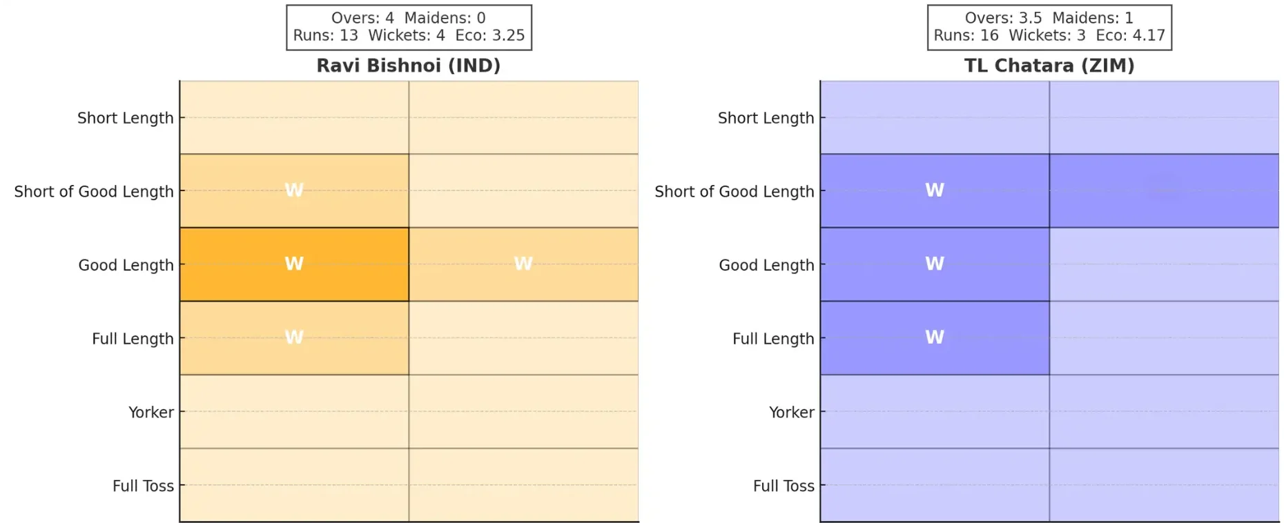 Ravi Bishnoiโs wrong โuns took 4 wickets for 13 runs. He bowled 22 googlies out of 24 balls cleverly. Washington Sundarโs 2-11 included two wickets in two balls. Zimbabwe slipped from 74-3 to 90-9 rapidly. Bishnoi cleaned up Bennett and Madhevere with precision. Sundarโs tight spell choked the scoring rate effectively. Indiaโs spin attack nearly won them the game. Only Madandeโs resistance saved Zimbabwe from a lower total.