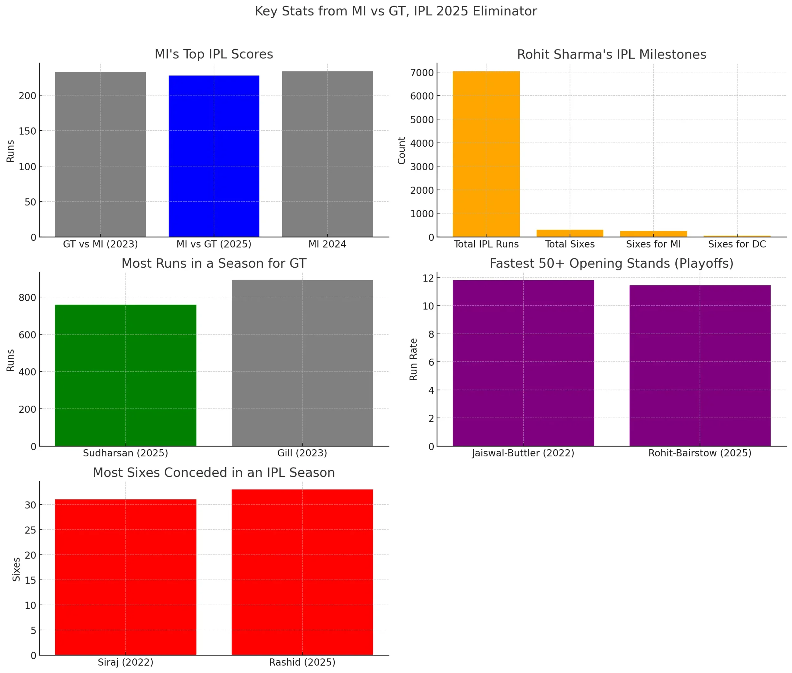 Mumbai Indians made a huge score of 228 runs. It was their second-highest in the IPL playoffs. Only GT’s 233 in 2023 was bigger. Five MI batters hit sixes three times each. They smashed 17 sixes in total. GT hit only eight sixes. This batting power won the game. Rohit Sharma led with 81 runs.