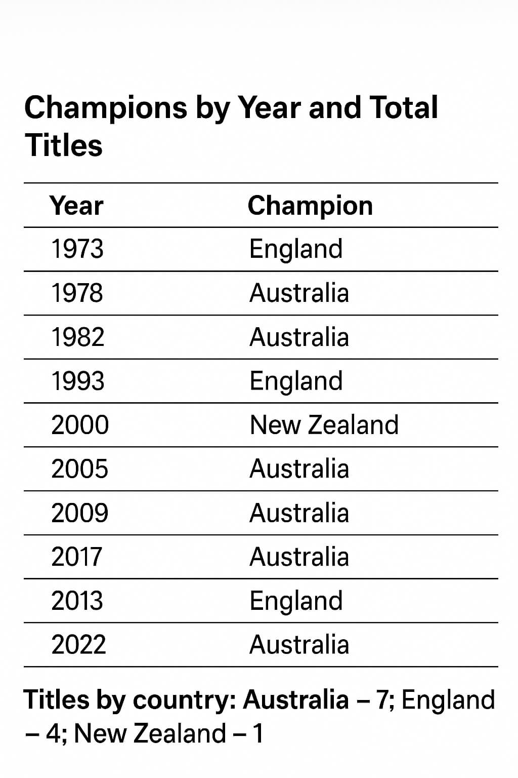 Titles by country: Australia – 7; England – 4; New Zealand – 1.